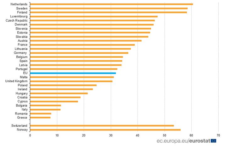 Οι Κάτω Χώρες (61%), η Σουηδία (59%) και η Φινλανδία (58%) είχαν τα υψηλότερα ποσοστά συμμετοχής στην επαγγελματική κατάρτιση. Τα χαμηλότερα ποσοστά ήταν στην Ελλάδα και τη Ρουμανία (8%) καθώς και στην Ιταλία (11%).