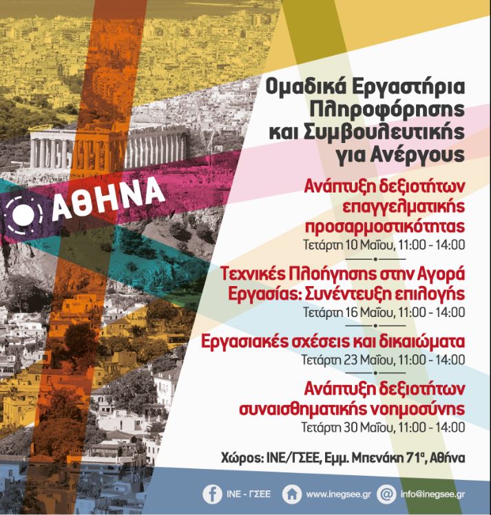 Το Δίκτυο Πληροφόρησης και Συμβουλευτικής Εργαζομένων και Ανέργων του ΙΝΕ ΓΣΕΕ θα υλοποιήσει στην Αθήνα, το μήνα Μάιο 2018, ομαδικά εργαστήρια πληροφόρησης και συμβουλευτικής για ανέργους.