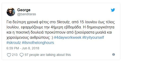 Είναι η δεύτερη χρονιά εφαρμογής της 4ήμερης εβδομάδας στην εταιρεία ηλεκτρονικού εμπορίου –ένα από τα μεγαλύτερα επιχειρηματικά success stories στην Ελλάδα– αλλά η πρώτη που ανακοινώθηκε δημοσίως, με ένα tweet.