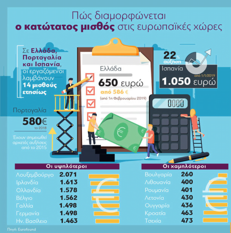 Στις χώρες της Ευρώπης υπάρχουν μεγάλες διαφορές στον ελάχιστο μισθό. Η βόρεια Ευρώπη είναι μακράν μπροστά και η απόσταση είναι μεγάλη από τις χώρες του νότου όπως η Ελλάδα, παρά την αύξηση που ανακοίνωσε η ελληνική κυβέρνηση από 1η Φεβρουαρίου 2019, από 586 σε 650 ευρώ.