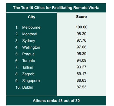 Η Μελβούρνη είναι η πόλη με την υψηλότερη κατάταξη στον σχετικό δείκτη ο οποίος περιλαμβάνει 80 πόλεις, σημειώνοντας καλή βαθμολογία σε ότι αφορά τους παράγοντες συμμόρφωσης στην απασχόληση, την ευτυχία των πολιτών και την βίζα για τους ψηφιακούς νομάδες. Το Μόντρεαλ και το Σίδνεϊ κατατάσσονται στη δεύτερη και την Τρίτη θέση. Το Δουβλίνο κατατάσσεται στην καλύτερη θέση σε ότι αφορά την ευκολία συμμόρφωσης στην απασχόληση, που σημαίνει ότι οι ισχύοντες κανονισμοί είναι πιο απλοί, και ακολουθούν το Ελσίνκι και η Κοπεγχάγη. Η πόλη με τους πιο ευτυχισμένους πολίτες είναι η Κοπεγχάγη, ακολουθούμενη από τη Βέρνη και το Ουέλινγκτον. Η Κωνσταντινούπολη έχει τους πιο ευνοϊκούς φορολογικούς συντελεστές για τους εξ αποστάσεως εργαζόμενους, και ακολουθούν η Λισαβόνα και το Χονγκ Κονγκ, ενώ η Αθήνα κατατάσσεται στην 48η όγδοη θέση της γενικής κατάταξης που περιλάβει τις 80 πόλεις κορυφαίες πόλεις στον κόσμο με σκορ 71,23 στα 100.