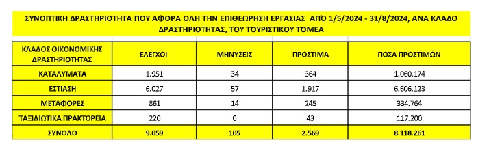 Στον πίνακα που ακολουθεί αναφέρονται τα στοιχεία ελέγχων, από τον Μάιο έως και τον Αύγουστο, ανά επιμέρους κλάδο του τουριστικού τομέα.