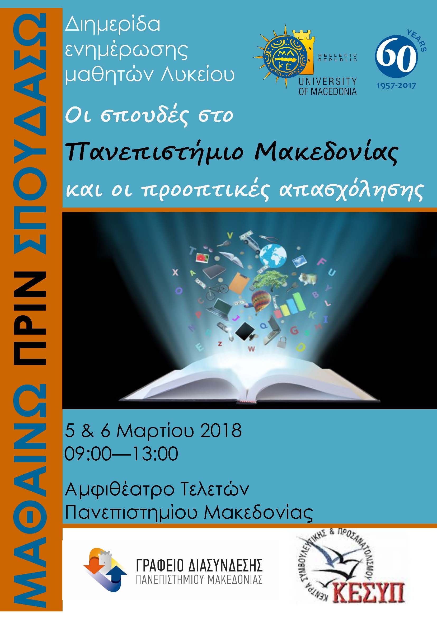 Την προσωπική τους εμπειρία από τη ζωή στο Πανεπιστήμιο Μακεδονίας θα καταθέσουν και φέτος φοιτητές του Ιδρύματος, ενώ μέλη του διδακτικού προσωπικού θα παρουσιάσουν τις Σχολές και τα Τμήματα του Πανεπιστημίου, κατά την καθιερωμένη εκδήλωση «Μαθαίνω πριν Σπουδάσω», τη Δευτέρα 5 και την Τρίτη 6 Μαρτίου 2018, από τις 9 το πρωί μέχρι τη 1 μετά το μεσημέρι, στο Αμφιθέατρο Τελετών του Πανεπιστημίου Μακεδονίας.