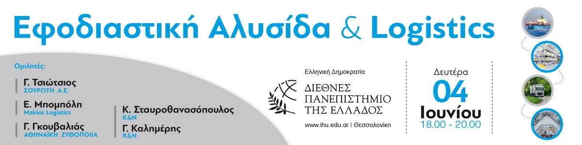 Το Διεθνές Πανεπιστήμιο της Ελλάδος  στο πλαίσιο της λειτουργίας του  Μεταπτυχιακού Προγράμματος «Διοίκηση Επιχειρήσεων», διοργανώνει εκδήλωση με θέμα «Εφοδιαστική Αλυσίδα & Logistics» την Δευτέρα 4 Ιουνίου 2018, 18:00-20:00 στο Διεθνές Πανεπιστήμιο της Ελλάδος με ομιλητές: