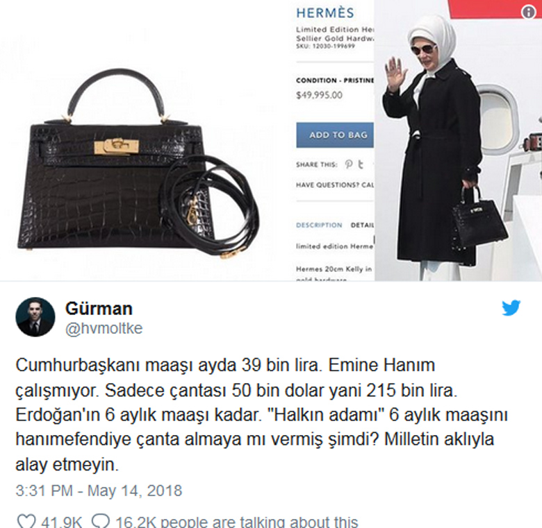 «Ο προεδρικός μισθός είναι 39.000 λίρες Τουρκίας. Η πρώτη κυρία δεν εργάζεται. Μόνο η τσάντα της, κοστίζει 50.000 δολάρια-δηλαδή 215.000 λίρες. Αυτό ισοδυναμεί με έξι μηνιαίους μισθούς του Ερντογάν», γράφει ο χρήστης του Twitter με το όνομα Gurman ο οποίος έχει πάνω από 50.000 followers στο Twitter. «Μου λέτε δηλαδή ότι ο άνθρωπος του “λαού”, ξόδεψε έξι μισθούς για να αγοράσει τη τσάντα της πρώτης κυρίας; Σταματήστε να προσβάλλετε τη νοημοσύνη των ανθρώπων» συμπλήρωσε.