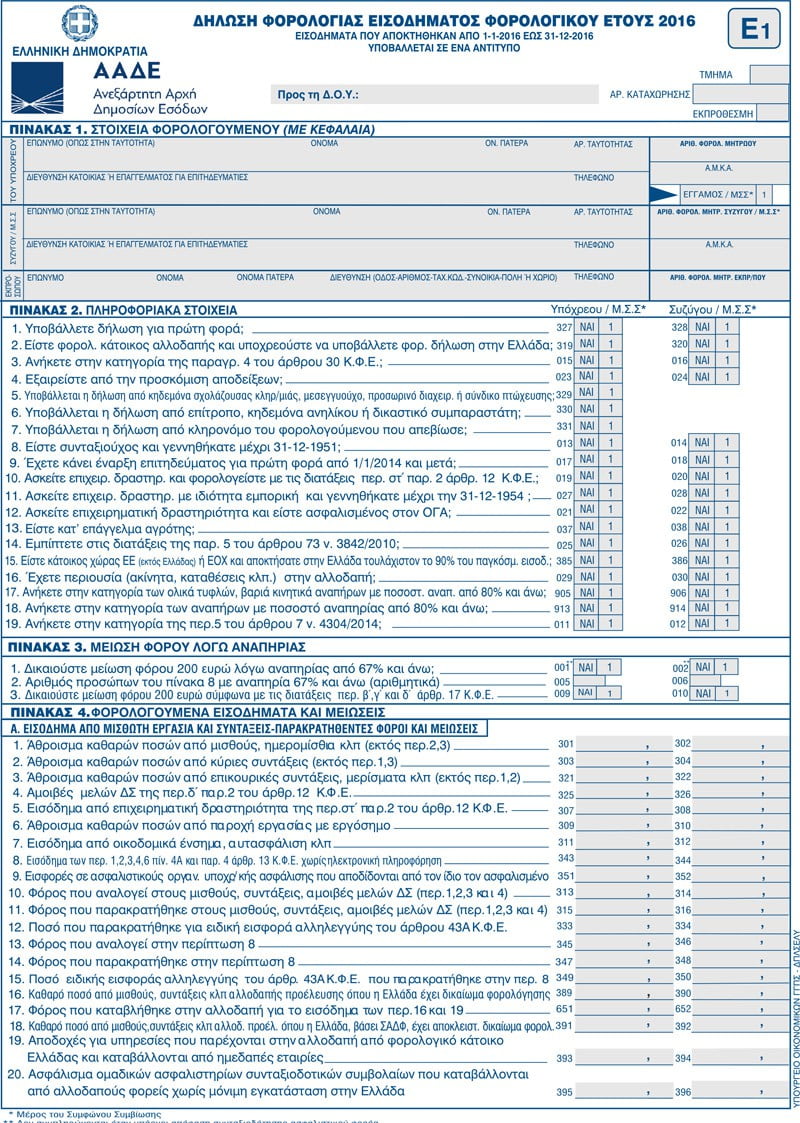 Αντίστροφα μετράει ο χρόνος για την υποβολή των φορολογικών δηλώσεων, καθώς πριν το Πάσχα θα ανοίξει η ηλεκτρονική πύλη του Taxis και δημοσιεύθηκε στο ΦΕΚ η απόφαση με τον τύπο και το περιεχόμενο των δηλώσεων φυσικών προσώπων για το φορολογικό έτος 2016 (έντυπα Ε1, Ε2, Ε3, Κ.Φ.Α., Ε16).