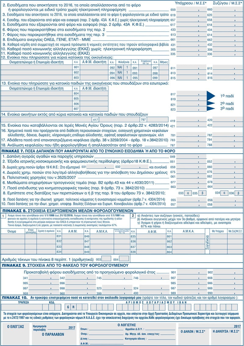 -055 – 056: για όσους χρηματοδότησαν το 2016 πολιτικό κόμμα ή συνασπισμό. Στην περίπτωση αυτή, η ιδιωτική χρηματοδότηση των κομμάτων και μέχρι του ποσού των 20.000 ευρώ εκπίπτει εξ ολοκλήρου από το εισόδημα του φορολογούμενου.
