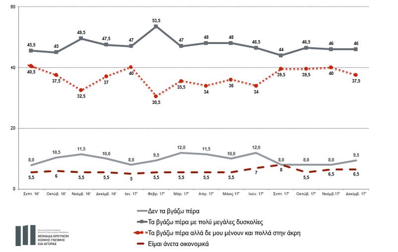 Ειδικότερα, σχεδόν πέντε στους 10 είναι εκείνοι που δηλώνουν πως τα βγάζουν πέρα με πολύ μεγάλες δυσκολίες. Ο αριθμός παραμένει σταθερός σε σύγκριση με τον Νοέμβριο του τρέχοντος έτους και παρουσιάζει πτώση της τάξεως του 1,5% σε σχέση με τον Δεκέμβριο του 2016.