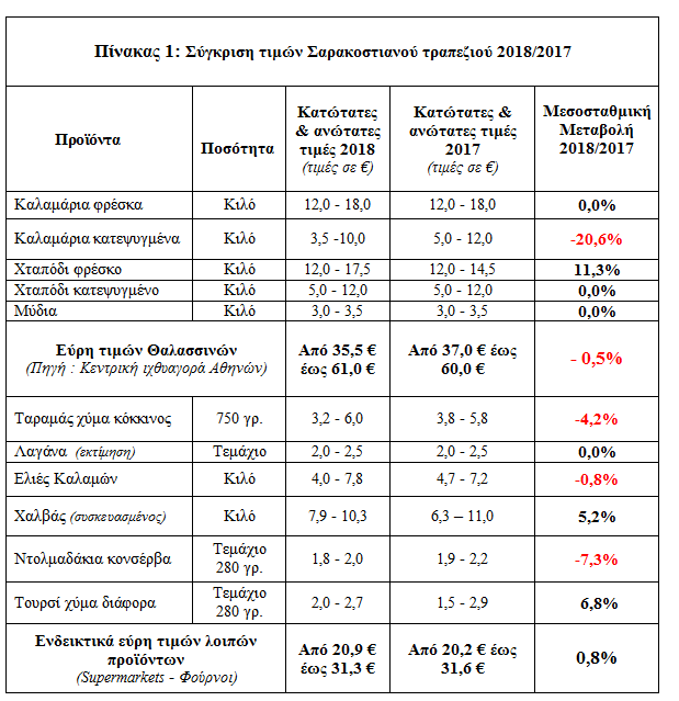Σύμφωνα με εκτιμήσεις της ΕΣΕΕ για το κόστος του Σαρακοστιανού τραπεζιού του 2018, από την καταγραφή του ύψους των τιμών ορισμένων βασικών προϊόντων που αποτελούν το σαρακοστιανό τραπέζι, προκύπτει μία μικρή μεσοσταθμική μείωση των ψαρικών και μία αντίστοιχου μεγέθους αύξηση για τα λοιπά συνοδευτικά προϊόντα (από σουπερ μάρκετ και φούρνους).