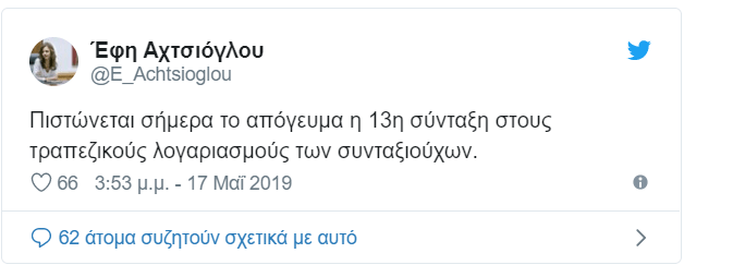 Την είδηση γνωστοποίησε μέσω Twitter η υπουργός Εργασίας, Έφη Αχτσιόγλου.