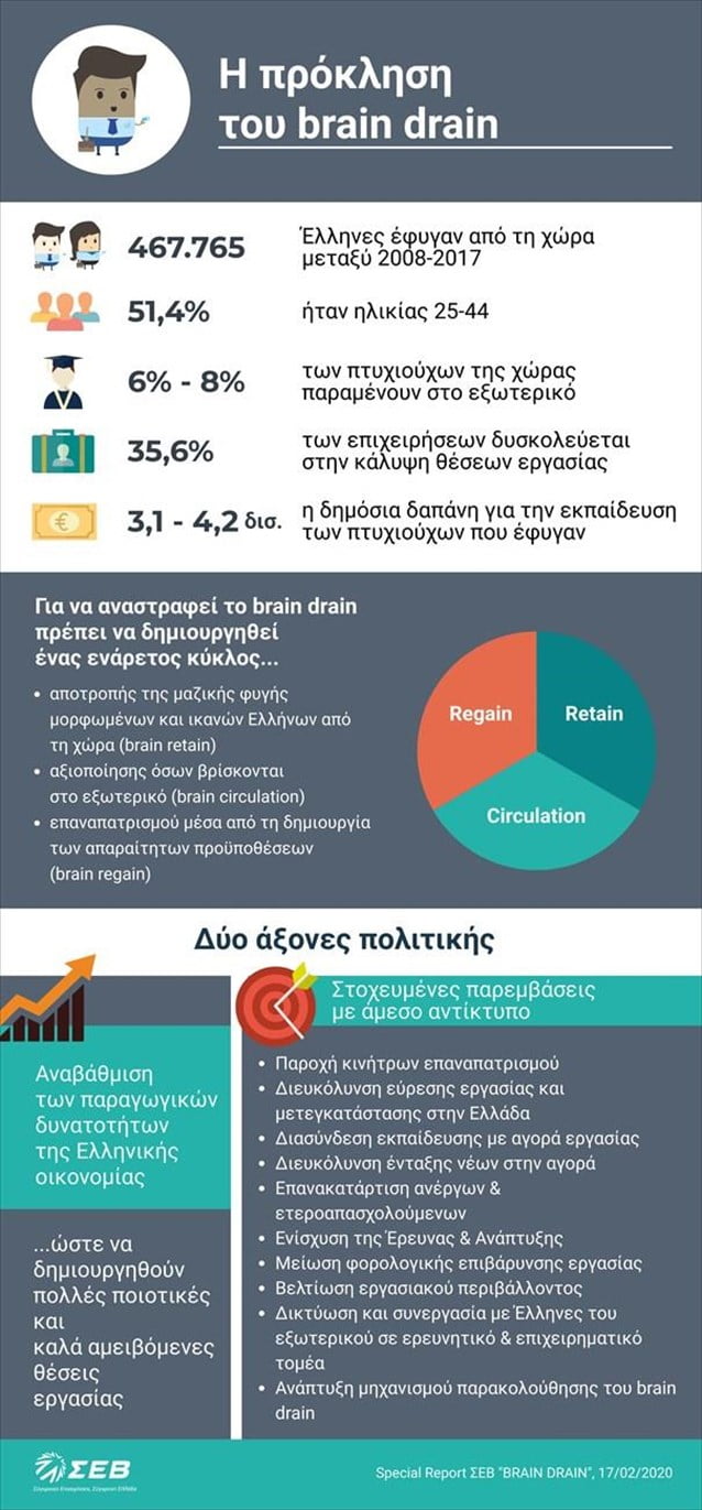 Σύμφωνα με στοιχεία που παραθέτει ο ΣΕΒ την περίοδο 2008-2017 έφυγαν από τη χώρα περίπου 500.000 Έλληνες νέοι και ικανοί άνθρωποι, δηλαδή το 4,6% του συνολικού της πληθυσμού. Προέρχονται από το πιο παραγωγικό κομμάτι της Ελληνικής κοινωνίας με το 51,4% να είναι στην «κρίσιμη» ηλικιακή κατηγορία 25-44, και σχεδόν στο 70%, απόφοιτοι ανώτατης εκπαίδευσης. Σύμφωνα με τις διαθέσιμες έρευνες, μεγάλος αριθμός αυτών που έφυγαν, είτε δεν σκοπεύουν να γυρίσουν καθόλου, είτε προσδιορίζουν τον επαναπατρισμό τους στο απώτερο μέλλον και υπό συγκεκριμένες προϋποθέσεις.