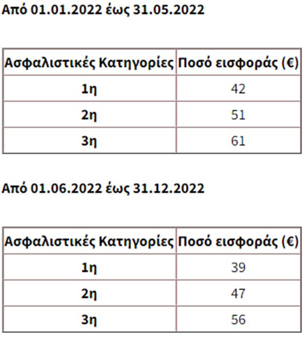 Από τον επόμενο μήνα, οι εισφορές αυτές θα διαμορφωθούν ως εξής. Όσοι έχουν επιλέξει την 1η κατηγορία, θα πληρώσουν 39 ευρώ (αντί για 42 ευρώ). Όσοι έχουν επιλέξει τη 2η κατηγορία, θα πληρώσουν το ποσό των 47 ευρώ (αντί για 51 ευρώ), ενώ όσοι έχουν επιλέξει την 3η κατηγορία, θα πληρώσουν το ποσό των 56 ευρώ (αντί για 61 ευρώ.