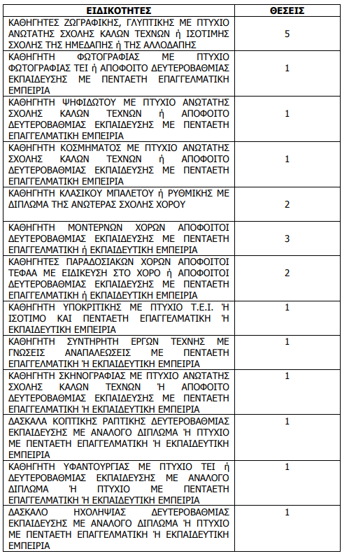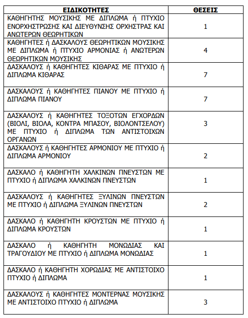 Εικοσιένα (21) καθηγητές ή δάσκαλοι στις εξής ειδικότητες: