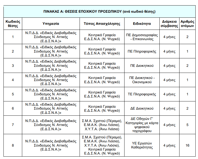 χρόνου, χρονικής διάρκειας τεσσάρων (4) μηνών, συνολικού αριθμού τριάντα (30) ατόμων, για την αντιμετώπιση της διασποράς του ιού COVID19, στο Ν.Π.Δ.Δ. «Ειδικός Διαβαθμιδικός Σύνδεσμος Νομού Αττικής (Ε.Δ.Σ.Ν.Α.)», που εδρεύει στο Δήμο Αθηναίων, και συγκεκριμένα του εξής, ανά υπηρεσία, έδρα, ειδικότητα και διάρκεια σύμβασης, αριθμού ατόμων: