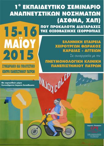 Η Ελληνική Εταιρεία Χειρουργών Θώρακος Καρδιάς Αγγείων και η Πνευμονολογική Κλινική του Πανεπιστημίου Πατρών, διοργανώνουν την Παρασκευή 15 και Σάββατο 16 Μαΐου 2015, στο Συνεδριακό και Πολιτιστικό Κέντρο του Πανεπιστημίου Πατρών το «1ο Εκπαιδευτικό Σεμινάριο Αναπνευστικών Νοσημάτων (Άσθμα, ΧΑΠ) που προκαλούν Διαταραχές της Οξεοβασικής Ισορροπίας».